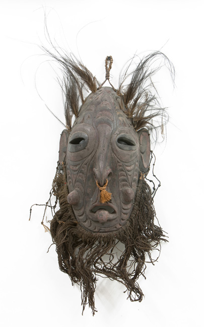 Mask – Papua New Guinea | wood, fiber & cassowary feathers | 386.16.06 | Donated by Fred & Susan Hartson |