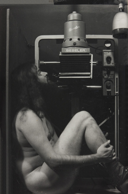 Self Portrait - Worshiping Ansel's Enlarger 1974 | silver gelatin print | 480.16.10 | Donated by Helen C. Harrison |