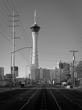 If one wants to discover more of Las Vegas, if a visitor would care to leave the temporal distortion of the casinos without clocks or windows, there is another very real side to this city. Plain enough, the photographs in this series do not depict the heavily marketed and most often perceived glamourous destination side of Vegas. And except as a point of reference, each of these photos do include the Stratosphere Tower, but they are not really about it. They ignore the pretense and imitation Las Vegas marketers would prefer to project about Las Vegas, instead offering a very real point-of-view of some of what can be found in the city surrounding the towering landmark. |