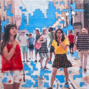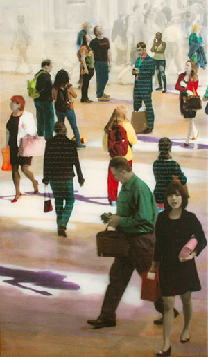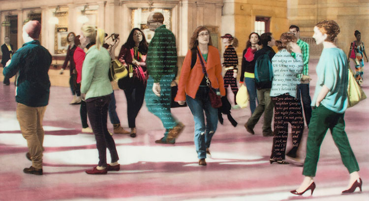 These mixed media, photo-based works explore the intricate tapestry of human identity and perception in urban landscapes. Originating from photographs taken in bustling metropolises like New York, Paris, and Milan, as well as iconic structures such as Grand Central Terminal, these pieces capture the essence of collective human experience while highlighting individual narratives. The artist employs a unique technique of superimposing fictional biographies onto figures in the photographs, personalizing them and making them stand out from the crowd. These brief narratives, born from imagination and based solely on appearance or stance, add depth to the artwork and invite viewers to engage more intimately with the characters portrayed. By "wearing" their stories like clothing, these individuals become emblematic of the complex identities we all carry. The incorporation of text serves multiple purposes. It adds another layer of complexity to the visual composition, encourages viewer participation through reading, and creates a bridge between the artwork and the audience's own experiences. This interactive element transforms the viewing process into a more immersive and reflective experience. A distinctive feature of these works is the inclusion of "ghost-like apparitions" fading into the background[9]. These ethereal figures symbolize the passage of time, representing individuals who have occupied the same space at different moments. This concept underscores our interconnectedness within the continuum of time, even if we remain unaware of these shared spatial experiences. Technically, these are unique pieces created on wood panels, not photo editions. The artist hand-paints all color elements using oil glazes, adding a tactile and personal touch to each work. The final surface is finished with a glossy UV resin coating, enhancing the visual impact and preserving the intricate details of each piece. |