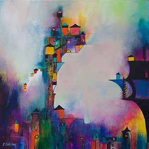 Colors layer around and through the original black marks, building complexity and depth. Occasionally, recognizable forms emerge from random shapes—a face, tree, or animal. Some works feature intentionally recognizable objects, such as the "Houses on a Hill" series inspired by her favorite painter, Paul Klee.
