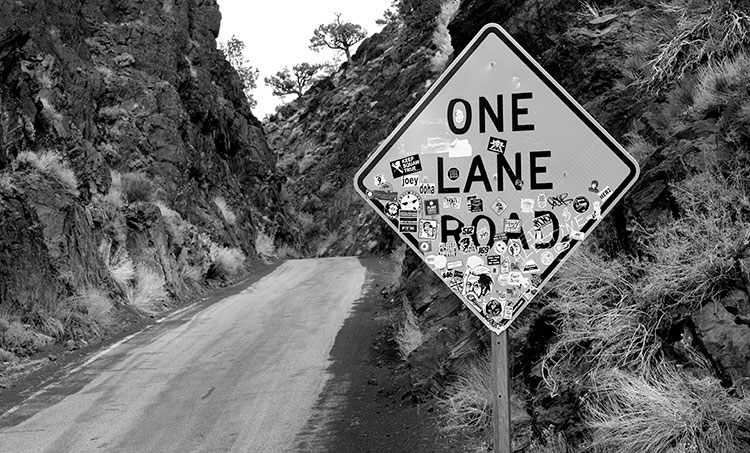 There's something beautifully rebellious about this photograph I captured—a simple "ONE LANE ROAD" sign transformed into an impromptu gallery. Its yellow diamond surface is nearly obscured by dozens of stickers, each one a tiny declaration of existence, a small act of creative defiance. When I took this shot, I was drawn to how art actually enters the world: not through galleries or formal exhibitions, but through the accumulated gestures of countless travelers who saw this lonely road sign and decided it needed something more. "Keep Tahoe True," one declares. Another shows a cartoon character. Band logos, inside jokes, mysterious symbols—a visual diary of everyone who passed this way and felt compelled to contribute. My choice to shoot in black & white elevates what could be dismissed as vandalism into something contemplative. The stark black and white forces us to see composition rather than individual colors or messages. The winding road disappears into the canyon, suggesting journey and possibility, while the sign stands as a monument to collective creativity—proof that art doesn't wait for permission. We're often taught that art happens in special places, made by special people with special training. But real creativity is more like this sign: an accumulation of small, authentic expressions building over time. The sketch in the margin. The song hummed while walking. The story shared over coffee. Choosing to add beauty to something that didn't ask for it, simply because we feel moved to do so. The canyon walls rising on either side frame this human expression against the vastness of geological time. Those rocks have been shaped by millions of years of natural forces. This sign represents our much quicker, more urgent need to mark our passage, to say "I was here" and "this mattered." Both are acts of creation, working on different timescales but sharing the same fundamental drive toward transformation. Like this road sign, our creative lives become rich not through single magnificent works but through the patient layering of authentic responses to the world around us. |